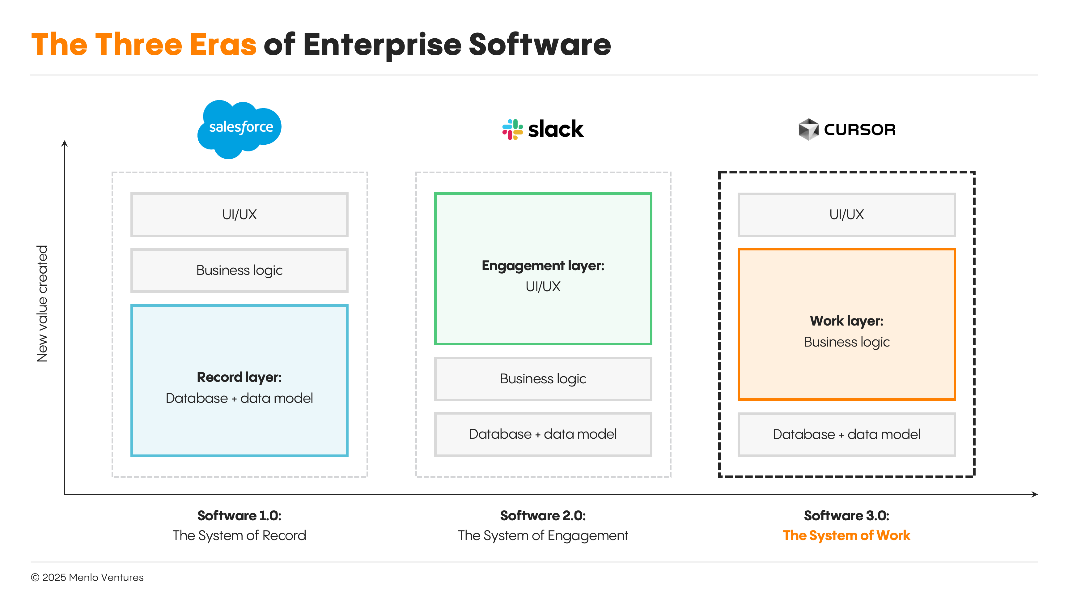Simply stated, modern software apps consist of three layers: the database and data model (record layer), the user interface and UX (engagement layer), and the business logic that connects them (work layer). The history of software innovation follows the shifts in value creation between these three layers.