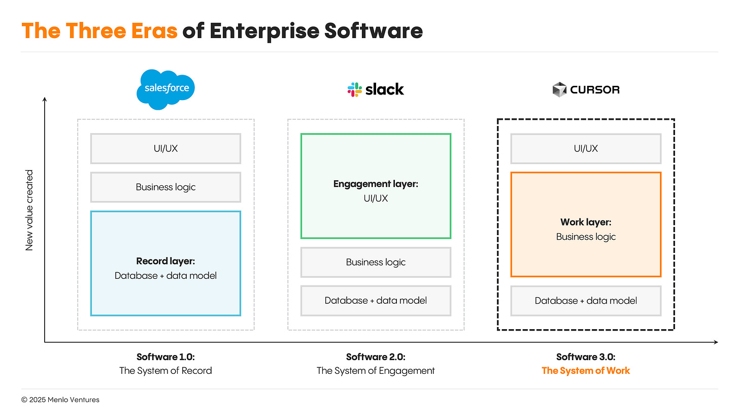 As AI shifts value from interfaces to logic, we’re witnessing the next era of enterprise software: systems of work. These programs don’t capture value through proprietary data or intuitive UX, but through the hidden architecture that transforms raw AI capability into real business automation.